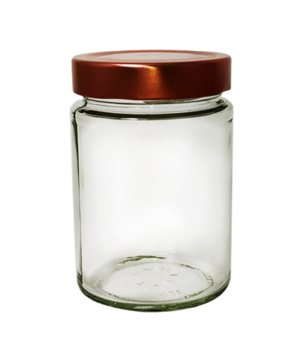 Pot en verre pour miel, confitures et bien d'autres préparations alimentaires. Il comporte une capsule de 66 profondeur qui peut être choisie en trois couleurs. C'est un vase à la ligne simple et élégante avec un fond plat sans courbes.